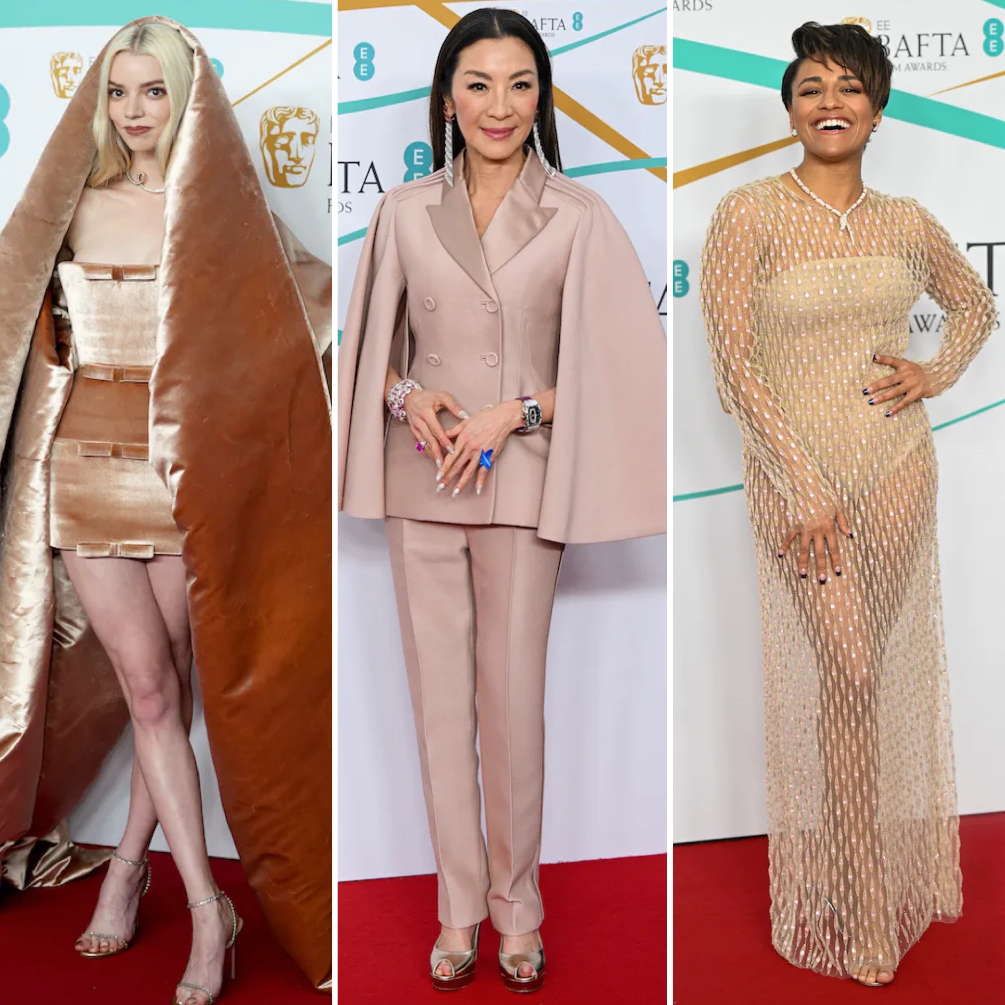 Anya Taylor-Joy in gold velvet Schiaparelli Couture ensemble, Michelle Yeoh in a blush Dior suit, & Ariana DeBose in a beige Fendi Haute Couture netted dress at the 2023 BAFTAs