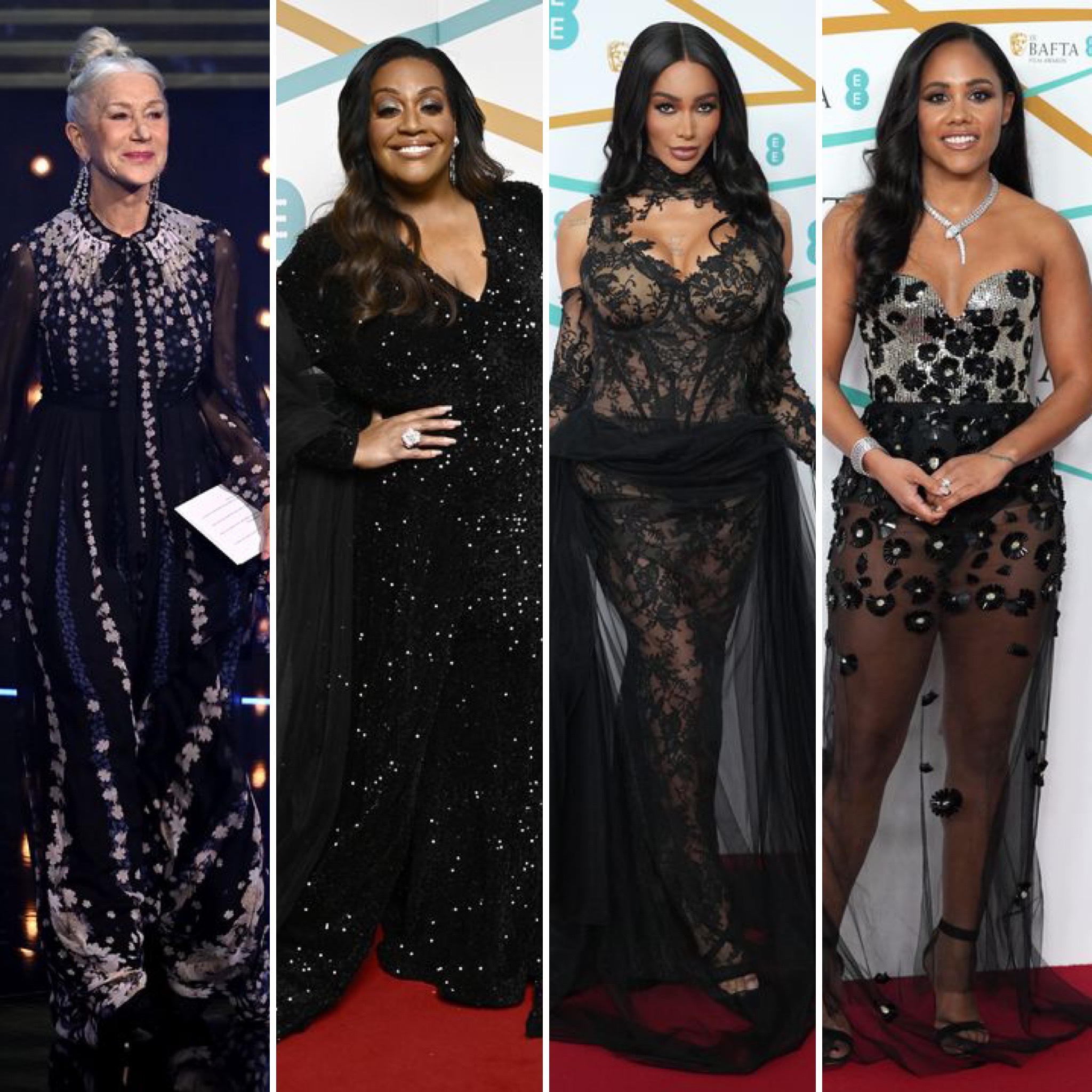 Helen Mirren in a black & silver cape gown, Alison Hammond in a black sparkling gown, Munroe Bergdorf in a black lace dress, & Alex Scott in a black & silver gown at the 2023 BAFTAs