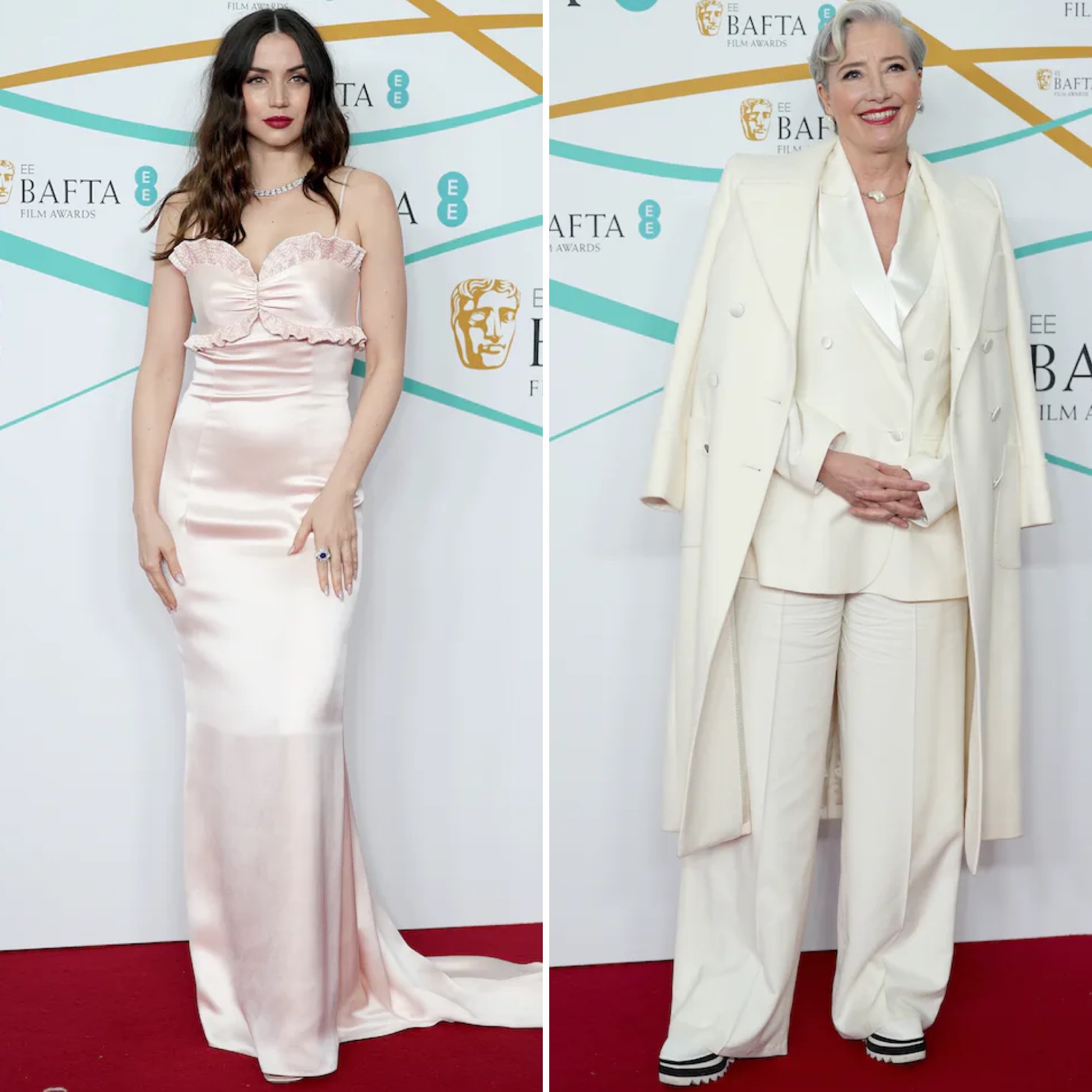 Ana de Armas in a blush Louis Vuitton gown & Emma Thompson in a white flowy suit at the 2023 BAFTAs