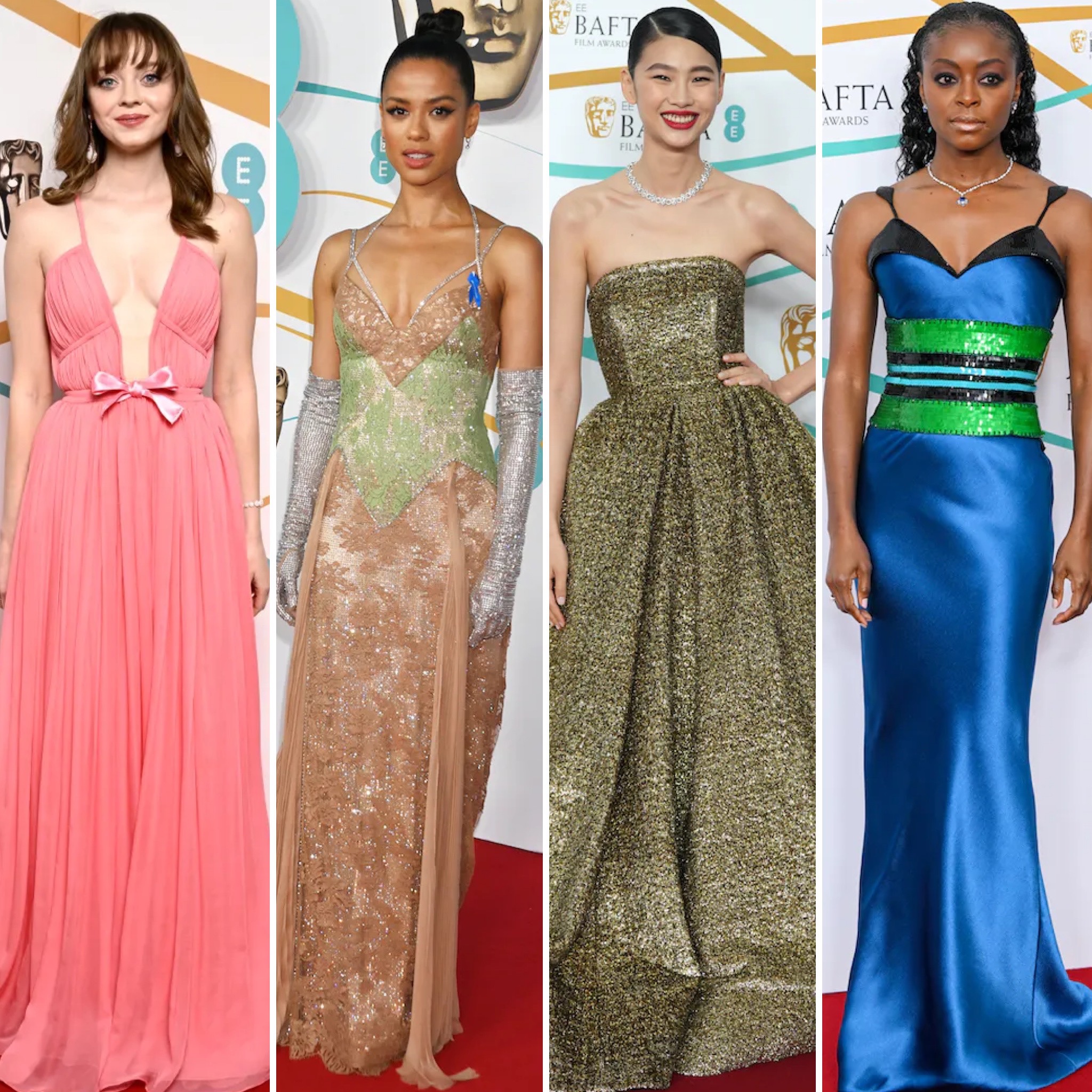 Madeline Arthur in a salmon deep-v Giambattista Valli gown, Gugu Mbatha-Raw in a multicolor lace Gucci gown, Hoyeon Jung in a gold strapless Louis Vuitton gown, & Danielle Deadwyler in a blue & green Armani Privé gown at the 2023 BAFTAs