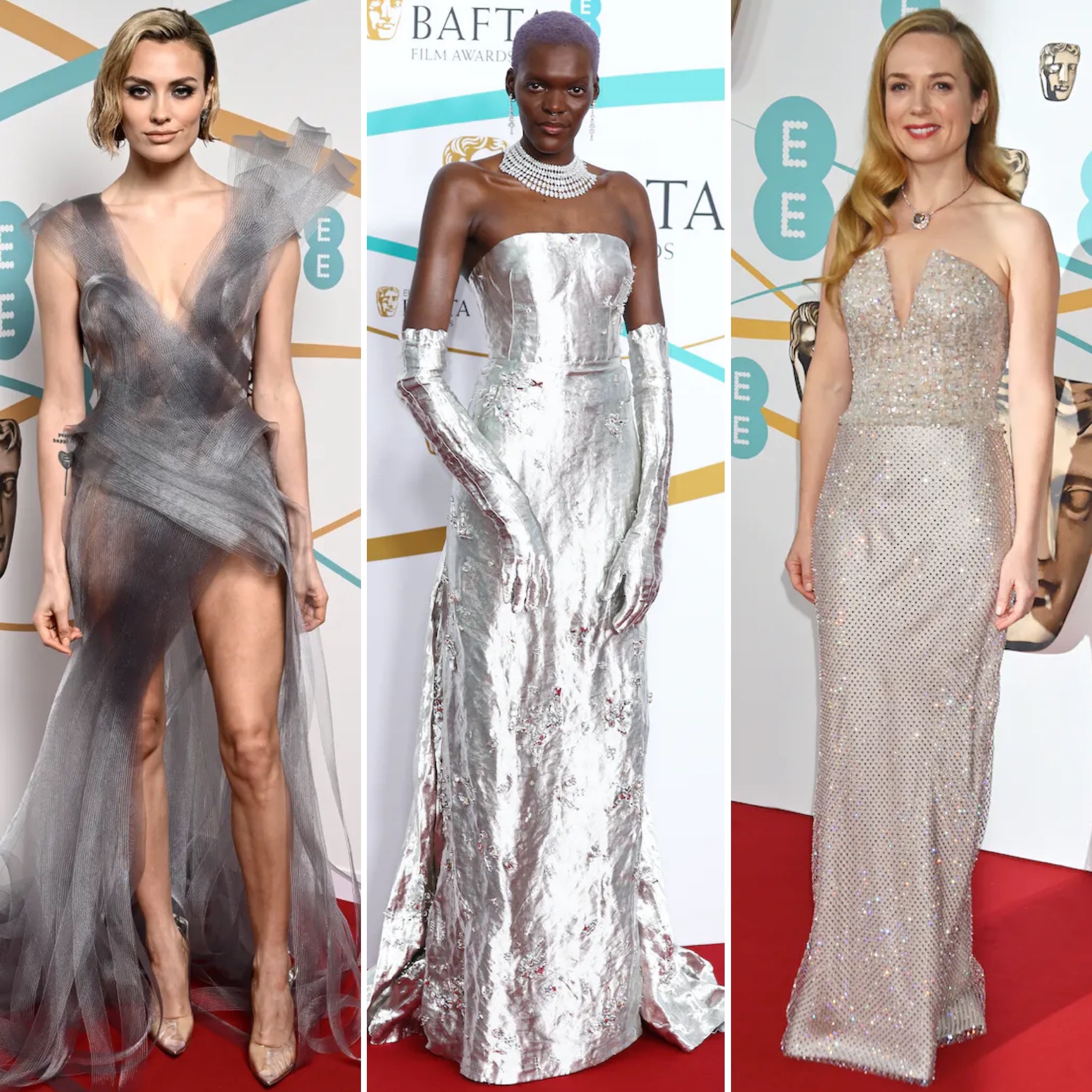 Wallis Day in a gray tulle gown, Sheila Atim in a silver foil strapless Prada gown, & Kerry Condon in a gown strapless gown at the 2023 BAFTAs