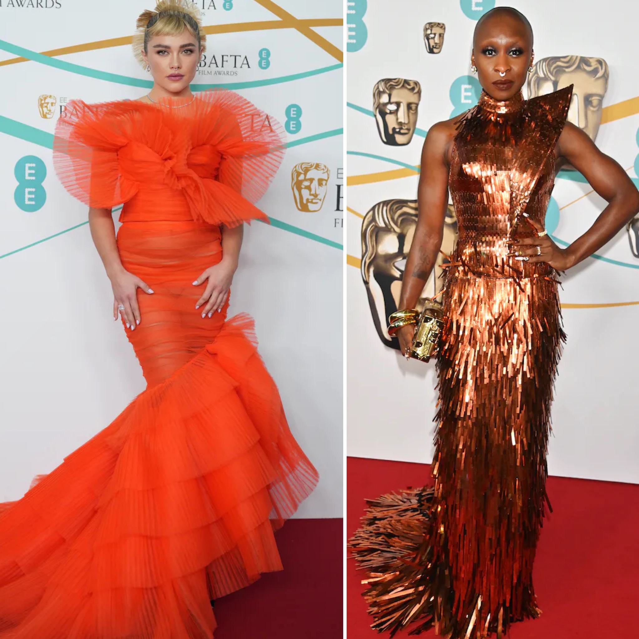 Florence Pugh in a tangerine ruched gown by Nina Ricci & Cynthia Erivo in a bronze Louis Vuitton gown at the 2023 BAFTAs