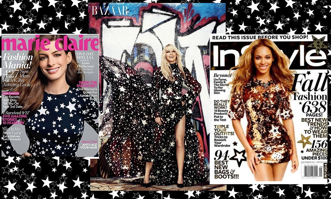 But if the runway isn’t somewhere you normally hang, take a look at the latest fashion magazine covers & their stylish cover girls, donning star-themed dresses by the famed fashion house.  This includes One Day‘s Anne Hathaway for Marie Claire, pop princess Britney Spears for Harper’s Bazaar, & everyone’s favorite Virgo, Beyonce for In Style!