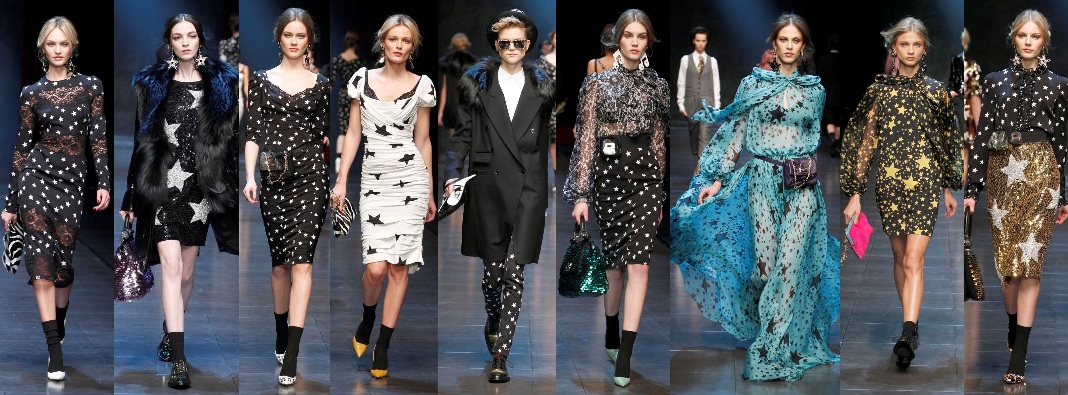 Dolce & Gabbana‘s latest fall / winter collection is headed for the stars- seriously! While playing with classic silhouettes in pencil skirts, flowy blouses, & oversized blazers, the mix of the celestial black & white pattern stands out even more with sequins, lace, animal print, & fur.  These are just a few of the very fabulous runway looks, courtesy of the official website. Even the separate items can be matched with dark denim skinny jeans, a bold tee, & colorful pointed tow heels & socks (as pictured).  To shop for these items, head over to Neiman Marcus, Nordstrom, Net-A-Porter, & Saks Fifth Avenue.  Which is your favorite?  Do you think stars look juvenile or luxury?