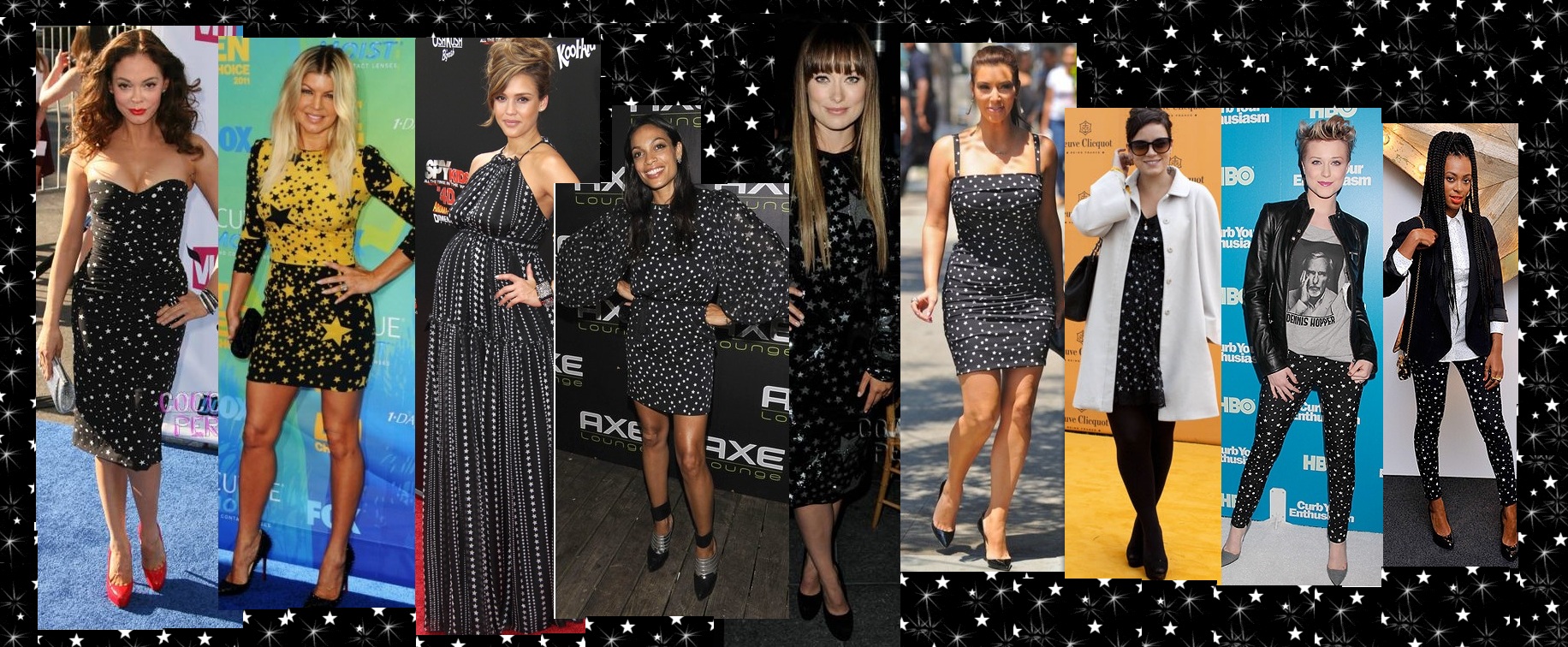 And since this is a partial red carpet post… Over the last few weeks, we’ve seen a slew of celebs of all styles opting for astronomical-inspired looks, as opposed to the tradition go-to polka dots or a simple LBD for camera-ready events.  First there’s Rose McGowan shows off her figured in a ruches sweetheart dress, Fergie isn’t afraid of color in the yellow & black mini, a very pregnant Jessica Alba wears a comfortable & elegant halter, Rosario Dawson plays with voluminous sleeves, Olivia Wilde sneaks around in sequins, Kim Kardashian isn’t afraid to wear curve-hugging stars during the dat, & Lily Allen is ladylike in a white coat & black tights.  Lastly, Evan Rachel Wood & Solange Knowles take on this print in legwear, both pairing the pants with loose-fitting tops & a masculine black jacket!