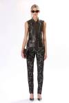 As for wearing leather bottoms, you have a chic choice of skirts or leggings. Of course, there are shorts out there, as well as cropped trousers, but here I’m focusing on recreating skirts & leggings as seen by the celebrities above. This starts with the Rhyme Los Angeles perforated vegan leather skirt ($46.99) from Piperlime, which not only serves the environment, but also offers an upgrade to your professional office look. Also, for a pop of color, I love the Glamorous PU patent faux leather mini skirt ($42.43) in wine from ASOS, which adds a futuristic vibe to any button-down shirt, studded tank, or scoop neck pullover.