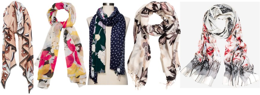 SHOP: abstract floral scarf @Ann Taylor, fuchsia floral scarf @dressbarn, floral & print scarf @Target, woven floral scarf @H&M, & meadow oblong scarf @White House Black Market.