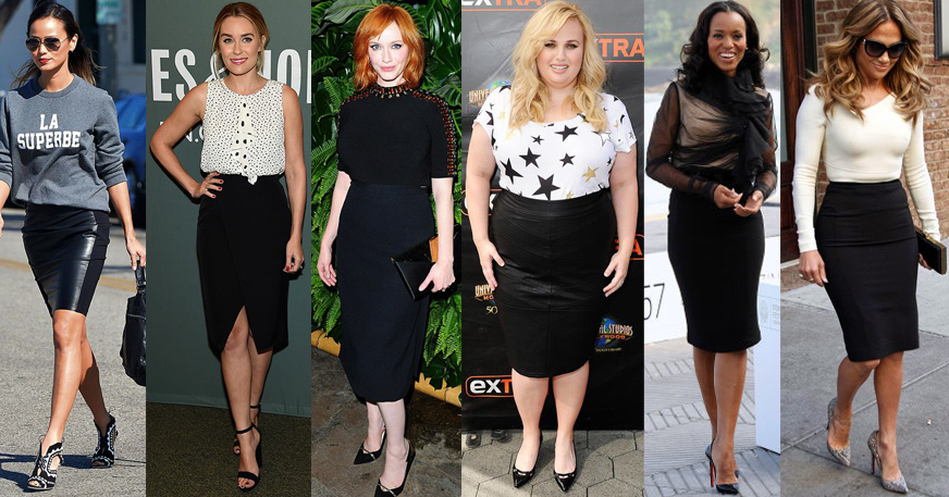 Check out the A-listers below to get inspired by all kinds of black pencil skirts & style choices, including blogger / actress Jamie Chung, designer / author Lauren Conrad, Mad Men star Christina Hendricks, Aussie actress Rebel Wilson, the flawless Kerry Washington, & the one & only, Jennifer Lopez.