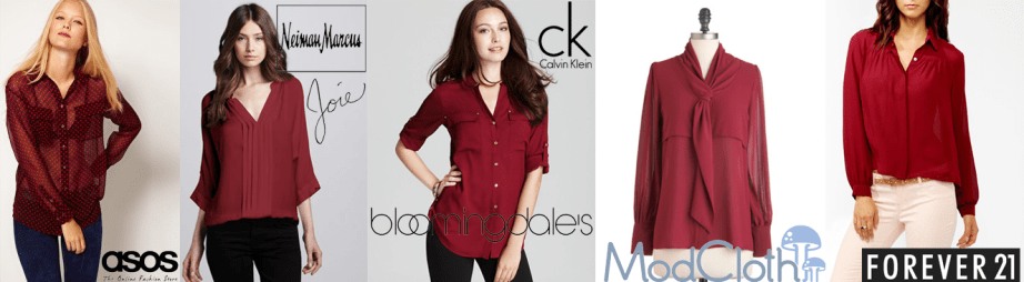 The color of the upcoming fall-winter season is burgundy & its related hues, including brick, deep red, maroon, oxblood, merlot, & so on. I have to say that this isn’t a color I wear often, but I can see the luxury in it, especially when it comes to classic & feminine pieces like a burgundy blouse. Lately, Style Darling has been all about what’s been going down at New York Fashion Week with manic posts under Runway Rundown, but if we’re going to look ahead, let’s talk about what we should be considering for updating our wardrobe this fall. Even if you’re not looking to stay on-trend, the idea of a burgundy blouse is pretty timeless. It will look lush & expensive against any black, gray, navy, cream, mustard (yes, I said mustard), or denim pieces that you already own & rely on for building your everday looks. Keep with the jewel tones & add a splash of deep purple for some colorblocking!