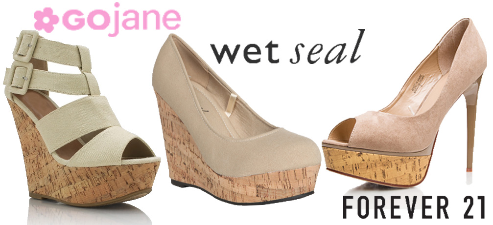 Being that I’m not going to spend that much cash on a pair of shoes for the spring, I was happy to find a more affordable look-alike in the Summer blush patent pumps ($19.99) @Steve Madden. The shape of the shoe’s vamp is a little different from the Michael Kors design, but it still has the same features to match any spring / summer look. More affordable nude / cork combos for the upcoming spring / summer season include GOjane‘s platform cork wedges ($29.40), the canvas cork wedge ($29.50) from Wet Seal, & printed cork peeptoe heels ($32.80) from Forever 21.