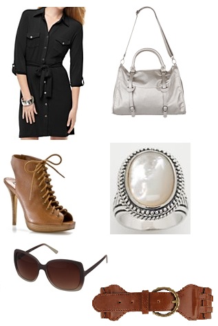 To put together a stylish ensemble like this, we have a few simple steps at affordable prices to help!  I searched high & low (& the search still isn’t over!) for a navy dress like the one is Amy wearing, but I found a black shirtdress @Macy’s for under $20.  You can switch up the fabric belt for a more special belt in cognac.  Don’t worry about the loop holes b/c something as thick as this from Forever 21 will cover them up & really cinch in your waist.  This is a little trick that celebrities like Kim Kardashian & America Ferrera always use.