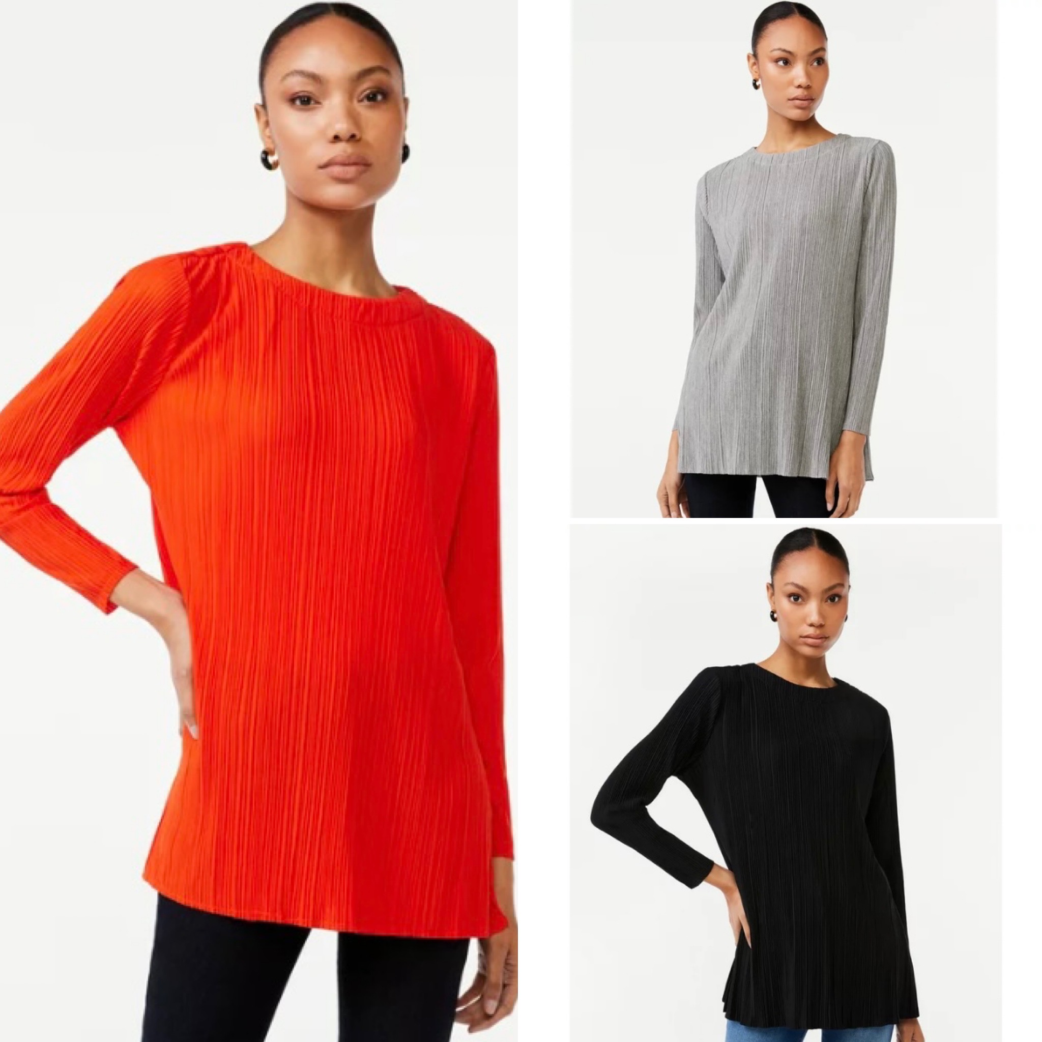 One such versatile & flattering tunic top that will get the job done for cooler days of work & play comes from Walmart, specifically the Scoop crinkle knit tunic top in red alert, heather grey, & black ($25.00, available in sizes XS-XXL).