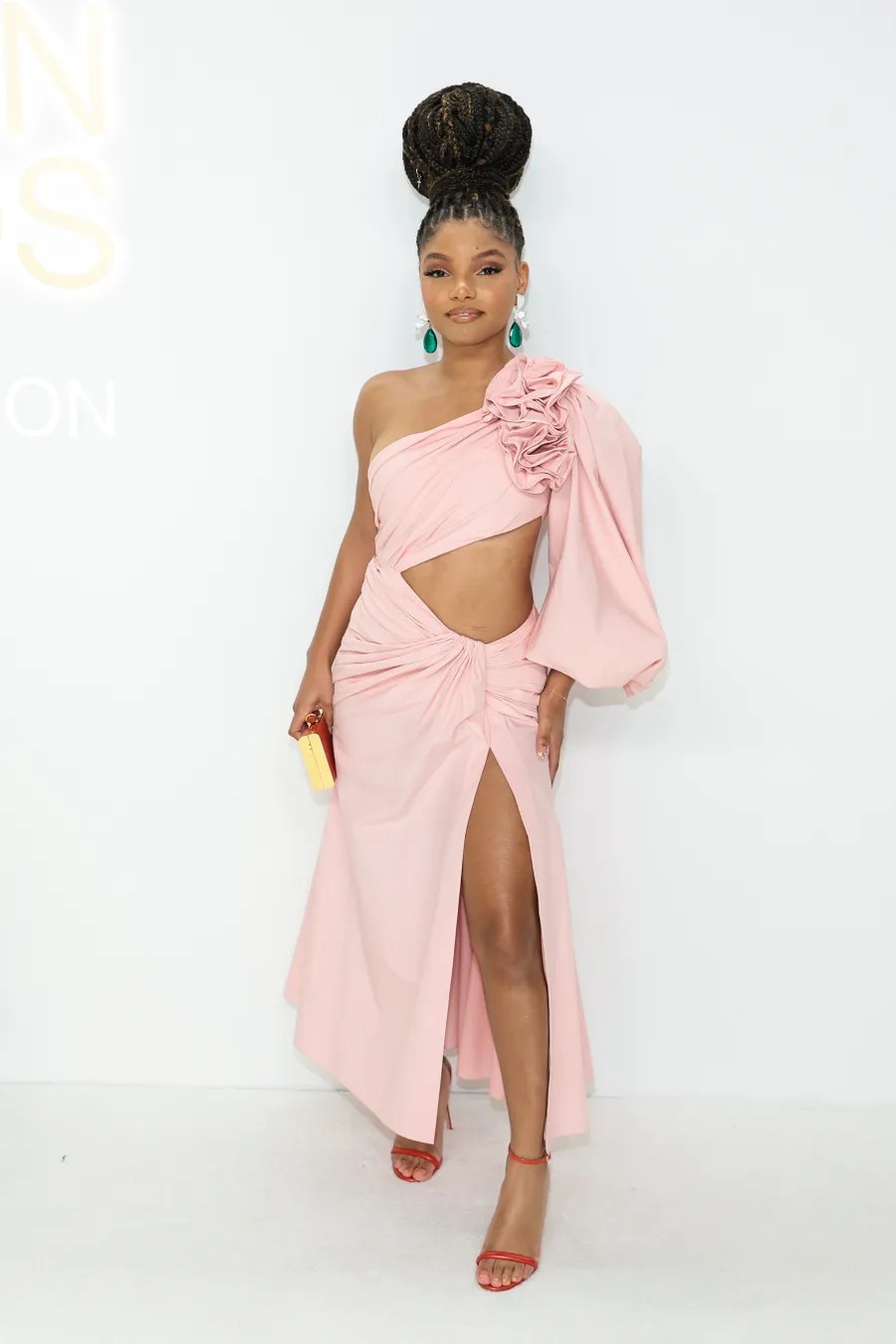 Stephanie Hsu in a pink bubble strapless gown & Halle Bailey in a powder blue Dolce & Gabbana ballgown at the 2023 Academy Awards
