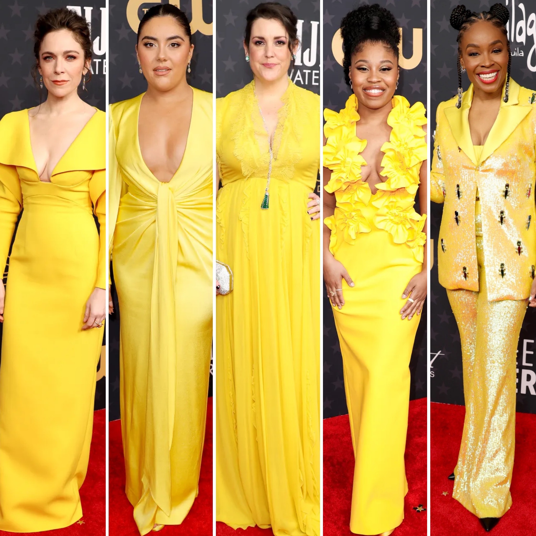Sheryl Lee Ralph in a gold one-shoulder Jovana Louis gown with Vince Camuto shoes & Misho Designs jewelry, Michelle Williams in a gold one-shoulder Louis Vuitton dress with Tiffany & Co. jewelry, Viola Davis in a shimmering brown cape gown by Valentino, Kate Hudson in a silver Oscar de la Renta gown with Bulgari jewelry & Christian Loboutin peep toe platforms, & Aubrey Plaza in a spaghetti strap Louis Vuitton gown with Pomellato jewelry at the 2023 Critics Choice Awards.