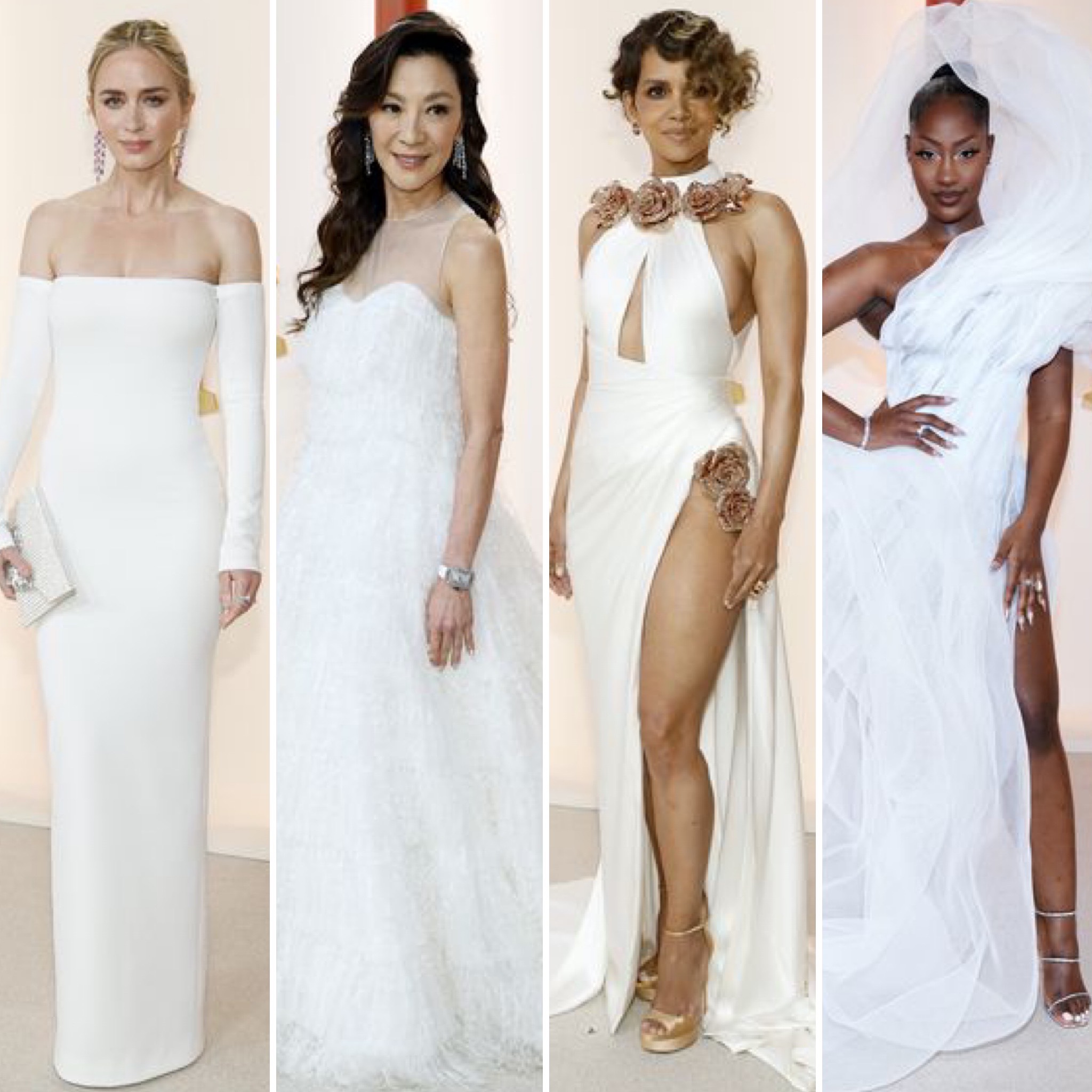 Emily Blunt in a white Valentino design, Michelle Yeoh in a white lace Christian Dior gown, Halle Berry in a high slit Tamara Ralph gown, & Tems in a white dramatic tulle gown at the 2023 Academy Awards