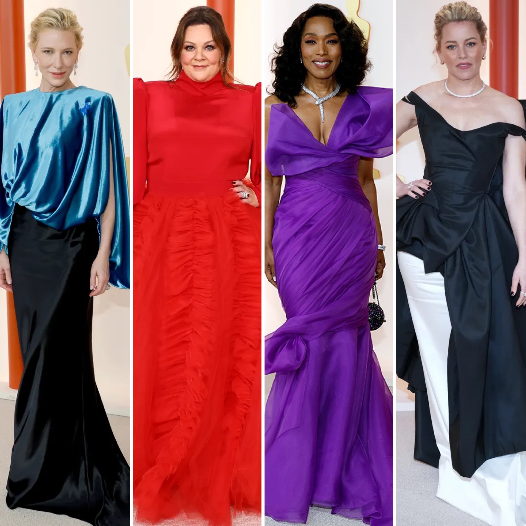 Cate Blanchett in a velvet Louis Vuitton gown, Melissa McCarthy in a red Christian Siriano gown, Angela Bassett in a purple Moschino gown, & Elizabeth Banks in a black & white gown at the 2023 Academy Awards