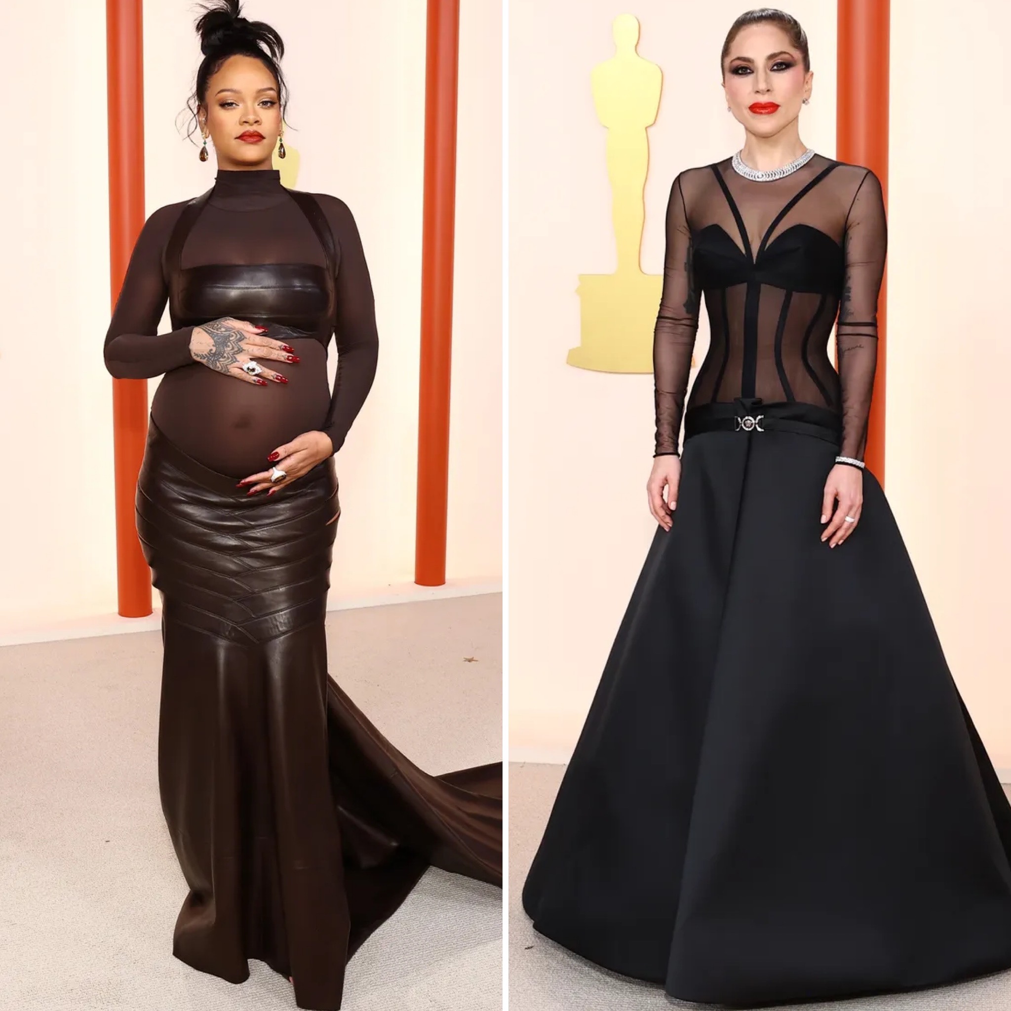 Rihanna in a brown leather Alaïa design & Lady Gags in Atelier Versace at the 2023 Academy Awards