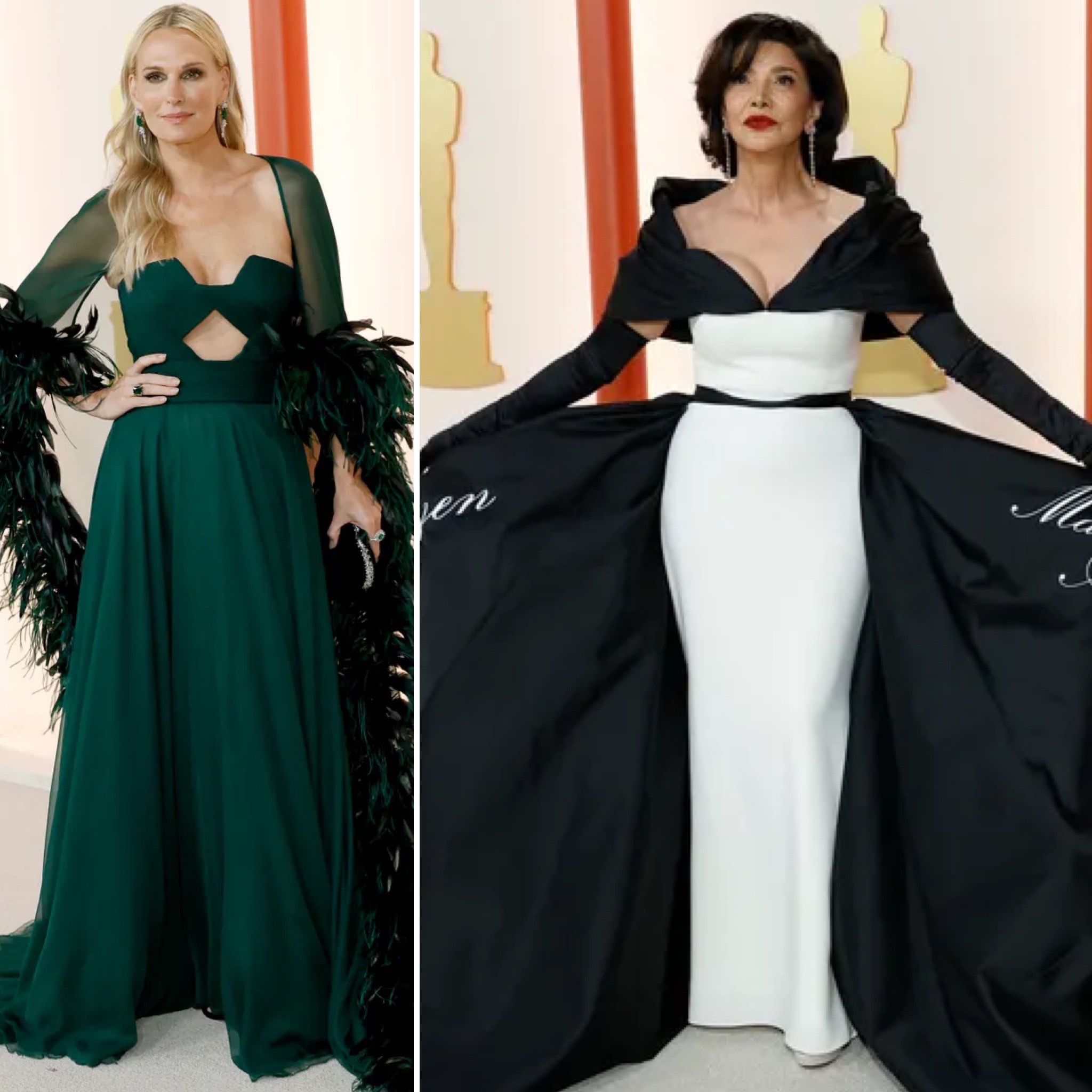 Molly Simms in a forest green gown & Shoreh Aghdashloo in a black & white gown at the 2023 Academy Awards