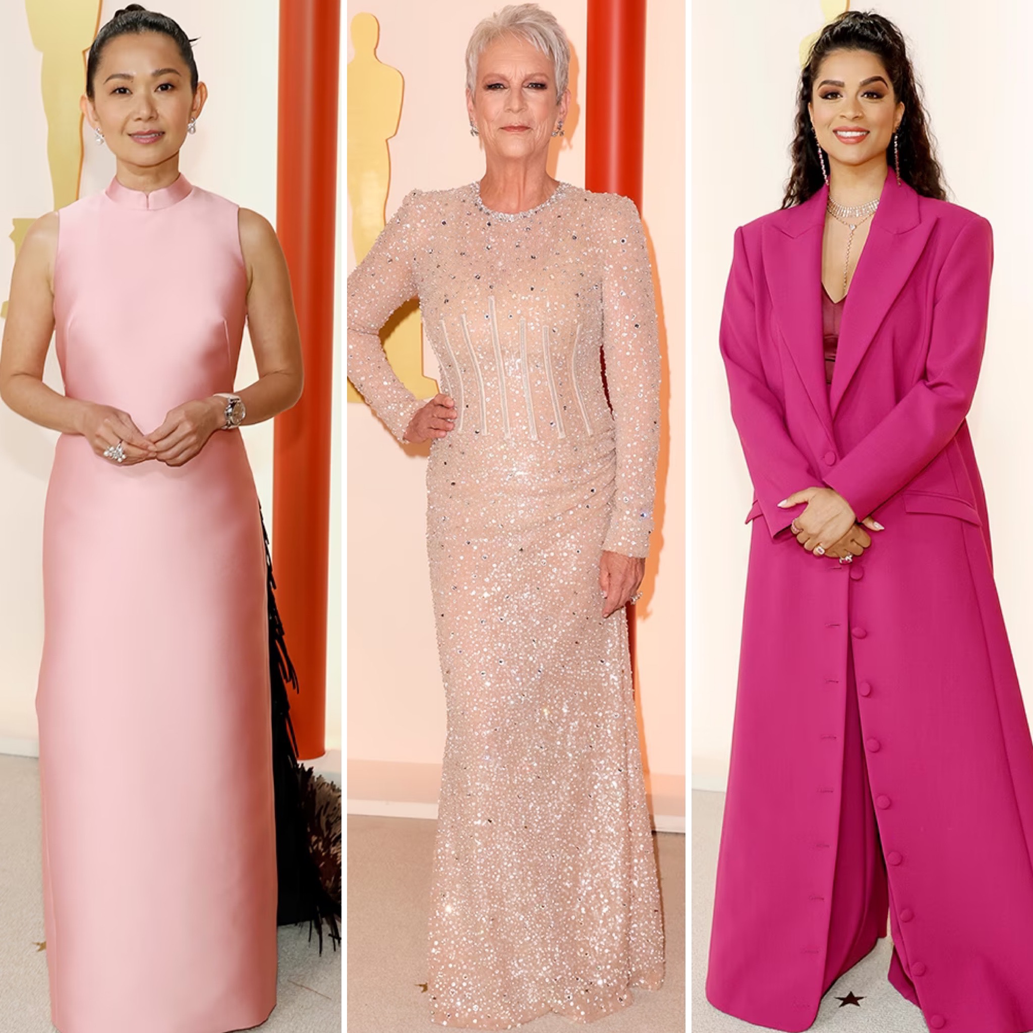 Hong Chau in a pink Parada gown, Jamie Lee Curtis in a sparkling nude Dolce & Gabbana gown, & Lilly Singh in a pink Christian Soriano suit at the 2023 Academy Awards